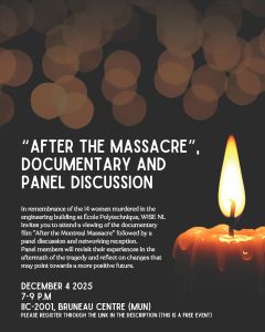 In remembrance of the 14 women murdered in the engineering building at École Polytechnique, WISE NL invites you to attend a viewing of the documentary film “After the Montreal Massacre” followed by a panel discussion and networking reception. Panel members will revisit their experiences in the aftermath of the tragedy and reflect on changes that may point towards a more positive future.