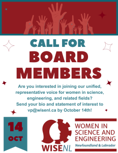 If you would like to serve on the Board, a brief bio and statement of interest should be sent to vp@wisenl.ca. Please indicate any prior WISE NL experience in your statement. Statement of interest and brief bio are due no later than October 14, 2025.