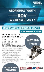 Marine Institute, will host an educational webinar through CITL. The webinar will take place May 17th, 2017 from 1 to 4pm. The goal of the webinar is to encourage aboriginal students (both female and male) to explore fields in S.T.E.M. The webinar will primarily focus on careers related to ROVs (remotely operated vehicles) and ocean technologies.